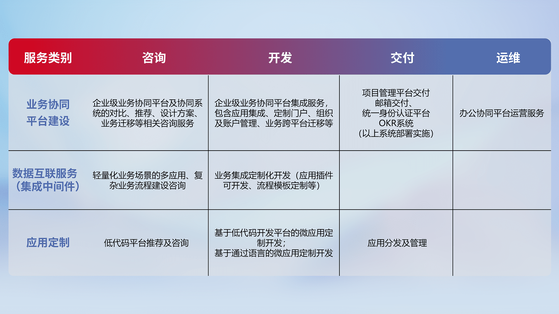 针对钉钉、、、、企微、、、IDaas等平台级产品提供产品的规划、、、、方案、、、交付、、、定制化开发等服务,,实现如统一协同办公、、、、智能客户服务、、、混合会议管理、、、、智能数据查询、、等业务场景,,,,实现数字化转型。。。。