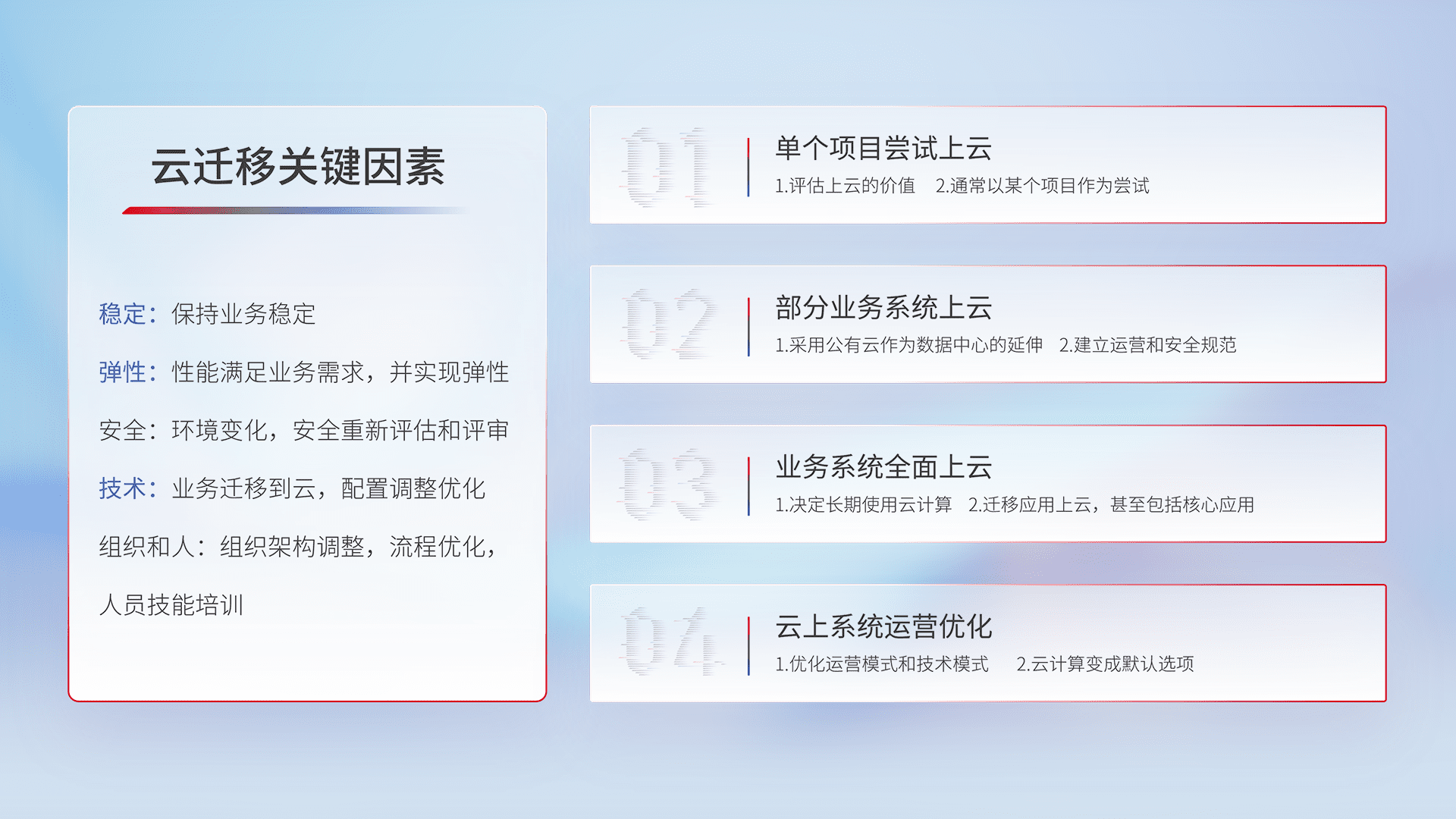 结合实际业务,,,从规划设计、、、云平台选型、、云原生改造、、、、数据迁移、、、、集成交付,,迁移全过程为客户识别最佳上云路径,,做好风险识别管理,,,,设计网络架构、、、身份权限、、安全审计合规、、操作审计、、、日志审计、、监控告警策略、、、多站点容灾设计等,,,对云上基础设施进行整体规划,,提升IT治理水平,,以满足弹性、、高可用、、、、高性能的需求。。。