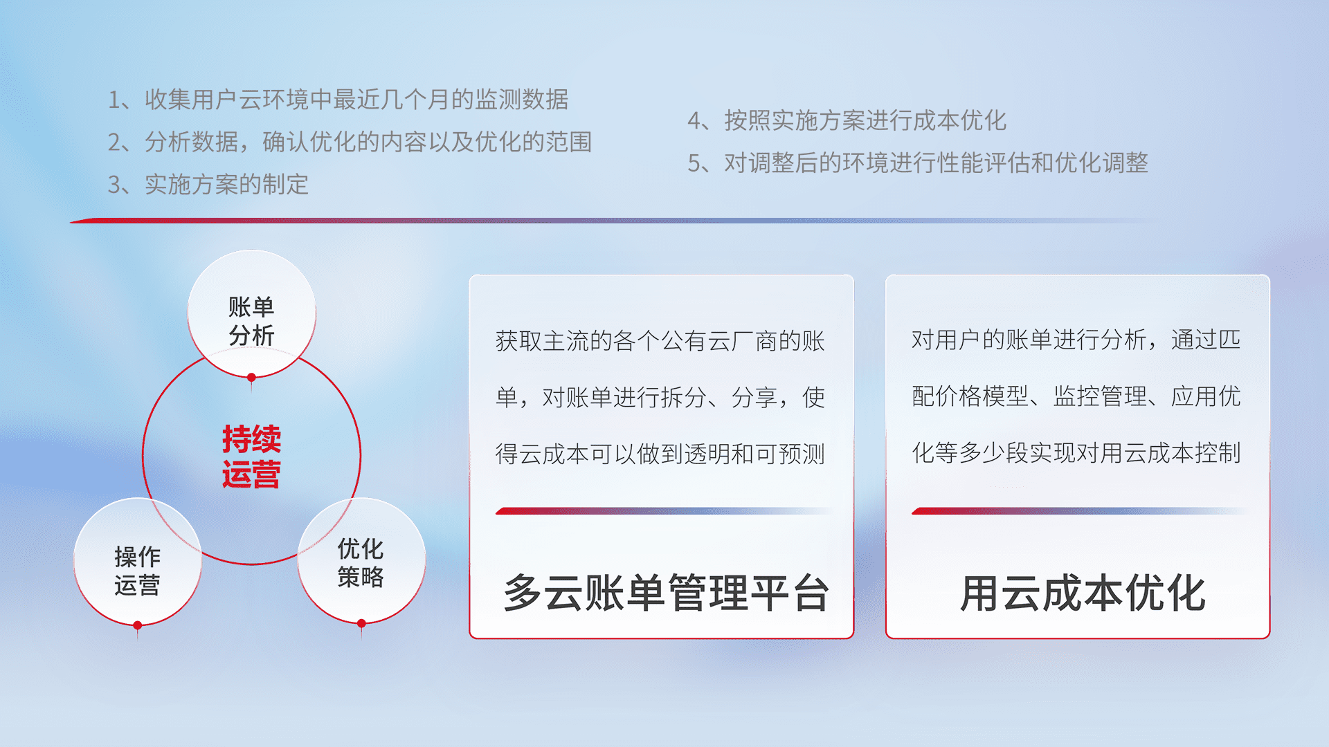 通过多云纳管,,以统一的资源数据模型把客户的云资源进行抽象和封装,,,,进而实现对多云资源的统一操作,,,保障云资源管理的可靠性、、、稳定性与可用性。。。量身定制化运维内容,,配置、、、、开发运维、、补丁管理、、、备份、、、监控、、、、认证和访问管理、、、审计和日常巡检等,,保障在用云过程中的可靠度,,,,稳定度以及高可用率。。。。
