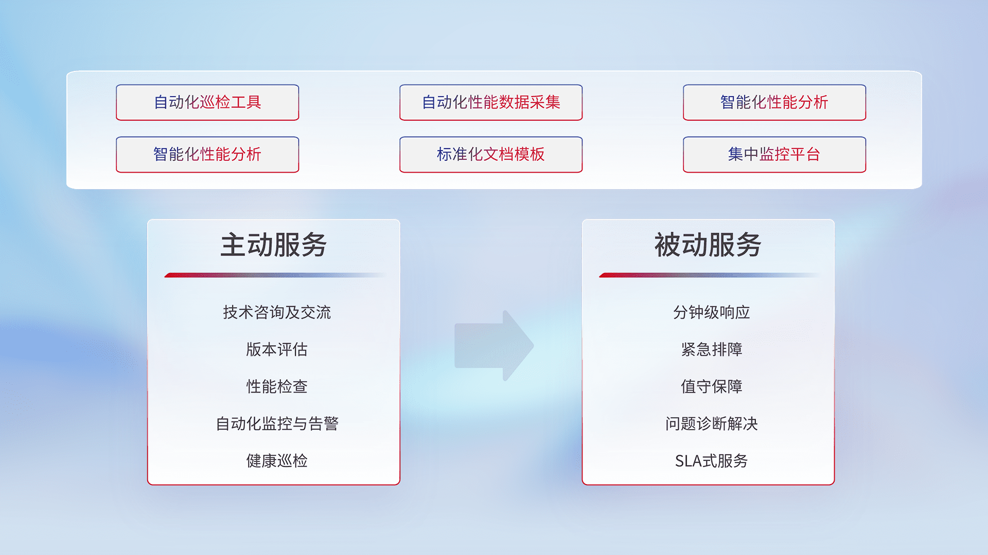 智能化工具和标准化文档,,保障服务质量,,,,提供主动服务(包含技术咨询、、版本评估、、、性能检查、、自动化监控与告警、、健康巡检)和被动服务包含(分钟级响应、、紧急排障、、、值守保障、、、、问题诊断解决、、、SLA服务)。。